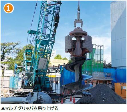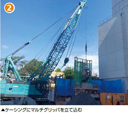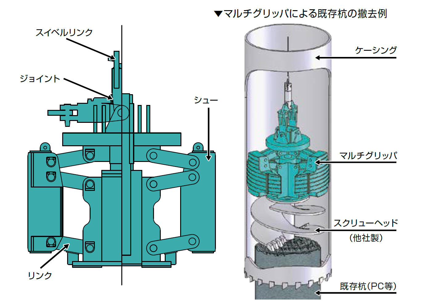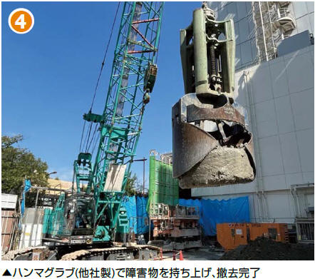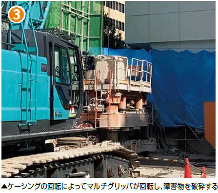 マルチグリッパは鉄筋コンクリート基礎や鋼杭などの地中障害撤去に威力を発揮するケーシング内部掘削装置です。