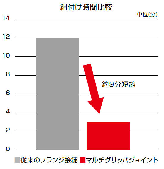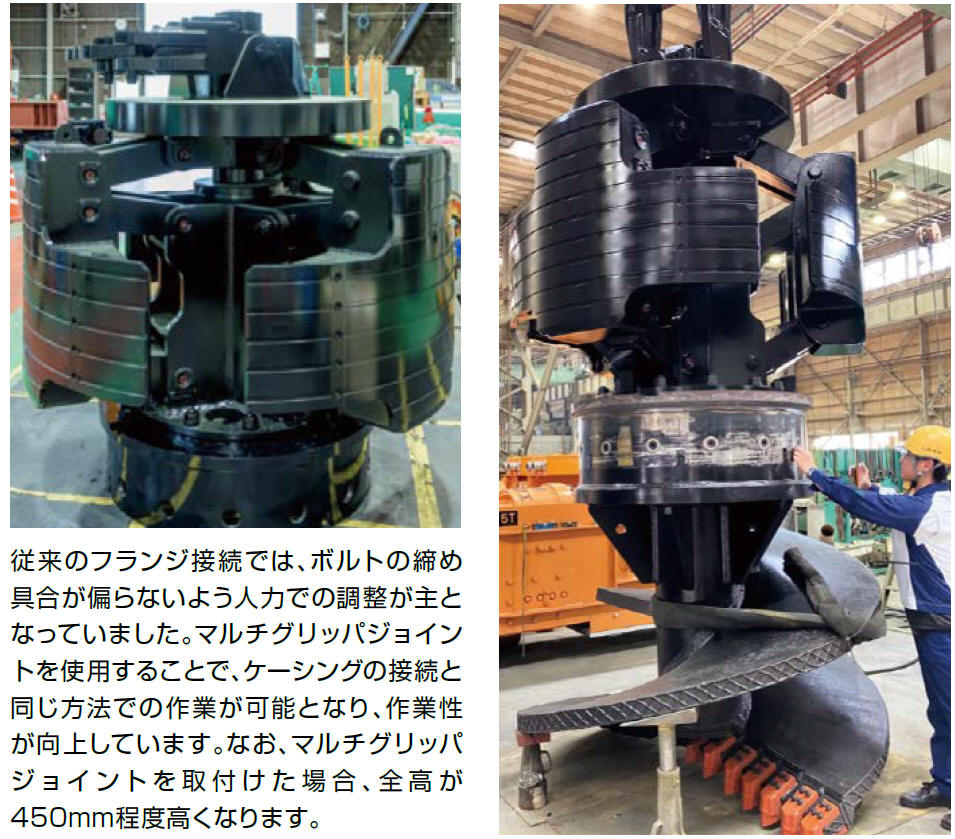 マルチグリッパとスクリューヘッドを、従来のフランジ接続からジョイント接続に変更する専用のジョイントです。 接続時間を大幅に短縮でき、組替回数が多い現場での施工時間短縮に貢献します。
