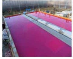 コンクリート打込み後、床版を3ヶ月間乾燥させた後に色水による湛水を1ヶ月間行いました。