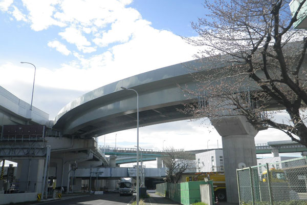 本工事は供用中の名古屋高速5号万場線と現在整備が進められている名古屋第二環状自動車道をつなぐランプ橋を施工するもので、現場は供用中の高速道路の近接作業と交通量の多い国道と県道の交差点直上部での高所作業が伴う、厳しい条件での施工となりました。このため、多くの設計変更と度重なる工期延伸を経て、延べ1,361日をかけて完成に至りました。