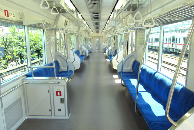 室内は青系のシートモケットとし、側、妻、仕切りには明るい白系の化粧板とすることにより明るく温かみのある配色としています。座席は簡易バケットタイプを採用し、座り心地向上と一人当たりのスペース明確化を図っています。 安全面については、火災発生時の延焼防止対策として前後位とも妻引戸の設置、車両間の転落防止ホロの設置などが挙げられます。 編成は3M3Tの構成で、合計3台搭載されているVVVFインバータ装置は、1台で4個の主電動機を制御しています。