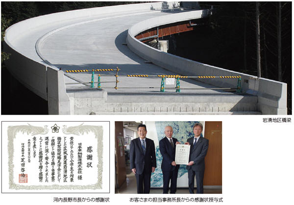本工事は、鋼3径間連続非合成曲線橋の製作架設工事で、送り出し工法で架設しました。曲率半径が小さい橋梁(R=140m)の送り出し架設は、難易度が高いため全国的にも珍しく、より安全面に重きを置いた施工を行い、無事故で工事を完成させました。 また橋梁近隣である河内長野市内の小学生及び保護者56名を対象とした現場見学会を開催し、河内長野市長より、感謝状を授与されました。 見学会では、「工場での橋の作り方」、「橋の架け方」などの説明、実際の現場に橋を架けている様子の見学、高力ボルトの締め付け体験等を実施いたしました。 このように、難工事を無事故で完成させたこと、地域貢献活動を積極的に行ったことから、お客さまの担当事務所長様より感謝状を授与されました。